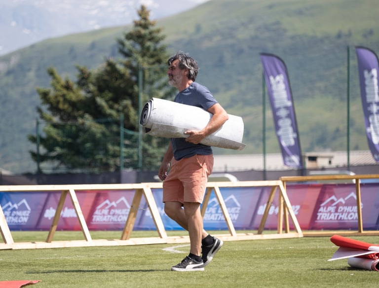 Laurence, Cyrille et leur fils Baptiste, tous trois passionnés par l'organisation d'événements. Après une carrière de triathlète de haut niveau, Cyrille Neveu et sa femme Laurence ont lancé le Triathlon de l'Alpe d'Huez.
